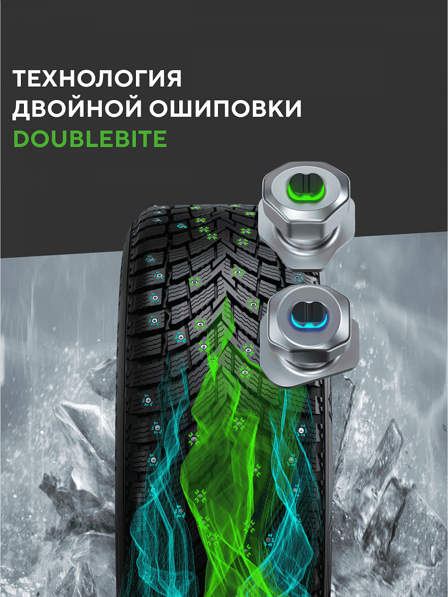 Прочная и надежная двойная ошиповка DoubleBite в сочетании с инновационной формой сердечника обеспечивают надежное сцепление как при разгоне и торможении, так и в поворотах на льду и снегу. Усиленная фиксация шипов значительно продлевает период эксплуатации шин. Качественные материалы повышают износостойкость шины и сохраняют надежное сцепление даже в суровых зимних условиях.